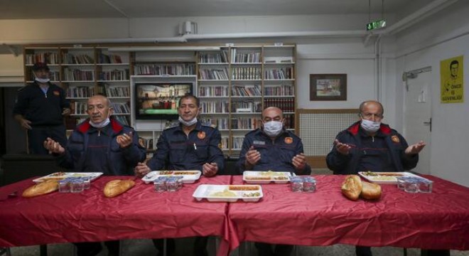 Ankara İtfaiyesi’ne bağlı Merkez İtfaiye İstasyonu'nda görevli itfaiyeciler, oruçlarını akşam nöbeti sırasında açtı.