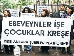 KESK Ankara Şubeler Platformu üyesi bir grup kadın, iş yerlerine kreş açılması ve ebeveyn izni düzenlemelerinin hayata geçirilmesi için eylem yaptı. Kızılay Metrosu çıkışında toplanan kadın çalışanlar, “çocuklar kreşe, ebeveynler işe” yazılı bir pankart taşıyarak, Başbakanlık Merkez Bina’ya kadar yürüdü. KESK Ankara Şubeler Platformu Dönem Sözcüsü Satı Burnucu Çalı, bugün Türkiye’de kamu emekçilerinin çocuklarıyla işbaşı yaptığını ve iki gündür iş yeri yönetimlerine kreş taleplerini dile getiren dilekçeler verdiklerini söyledi.