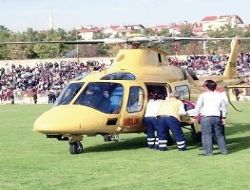 Kalp krizi geçiren 76 yaşındaki Kamil Saraçoğlu’nu almaya gelen ambulans helikopter, Beypazarı Şehir Stadı’na indi. Bu sırada Beypazarı Şekerspor- Kardemir Karabükspor arasında oynanan Ziraat Türkiye Kupası play- off maçına 10 dakika ara verildi.