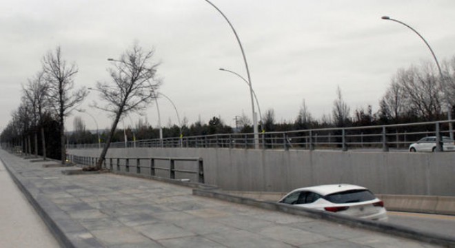 Ankara Büyükşehir Belediyesi’nce 4 yıl önce ulaşıma açılan 1071 Malazgirt Bulvarı üzerindeki ‘Şanzelize’ tipi ağaçlardan biri devrilme tehlikesi ile karşı karşıya kaldı. Bulvarın Söğütözü kesimindeki U dönüşünün iniş noktasına doğru eğilen ağaçsürücüleri tedirgin ediyor. Köklerinin bir kısmı toprak üzerine çıkan ağacın kuvvetli bir rüzgarda U dönüş geçidine giriş yapan araçların üzerine devrilebileceğini belirten sürücüler yetkililerin önlem almasını istedi.