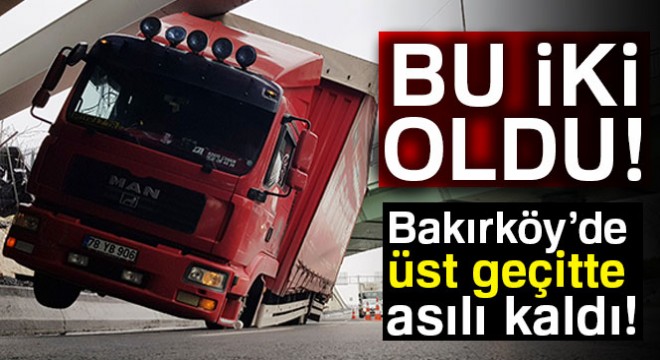 Bakırköy sahil yolunda üst geçidin yüksekliğini ayarlayamayan kamyon üst geçide çarparak iki tekerleği üzerine asılı kaldı. Geçtiğimiz günlerde de vinç taşıyan bir kamyon aynı köprüye takılarak devrilmişti.