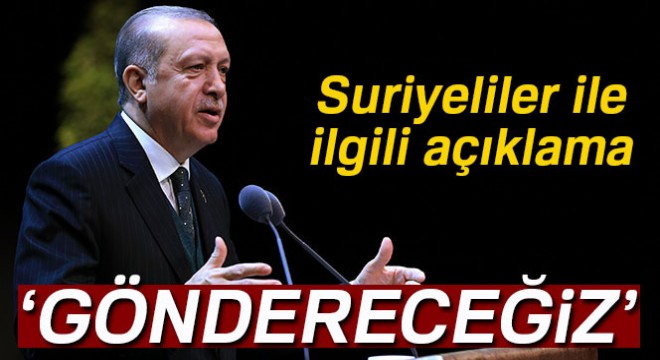Fırat Kalkanı Harekatı ile bölgenin teröristlerden arındırıldığını ve 2 bin kilometrekarelik alanda yapılan normalleşme çalışmalarını anlatan Erdoğan, "Afrin’de de aynısı olacak. Önce teröristlerin kökünü kurutacağız, sonra da oraya yaşanabilir hale getireceğiz. 3,5 milyon benim ülkemde misafir ettiğimiz Suriyeliler için. Tekrar onları topraklarına geri göndereceğiz. Sürekli olarak çadırda, konteynerlarda herhalde iskan edecek halimiz yok" ifadelerini kullandı.