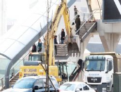 3- Dört şeritli otoyoldan ilerleyerek üst geçide gelen vatandaşları ise daha büyük bir tehlike karşılıyor. Çıktıkları merdivenin altında iki adet iş makinesinin çalıştığını görünce şaşkınlıklarını gizleyemeyen vatandaşlar, “Operatör bir yanlışlık yapsa merdiven üzerindeki insanlarla düşecek. Önlem alınmadan böyle çalışma yapılmamalı” dedi.