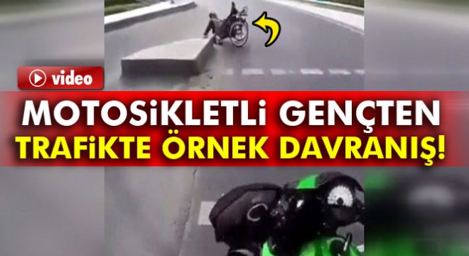 Bu sırada yolda ilerleyen motosiklet sürücüsü engelli vatandaşı fark edip yol verse de panik yapan adam tekerlekli sandalyesini devirdi. Engelli vatandaşın yardımına motorcu genç ve o sırada oradan geçen başka bir sürücü yetişti. Trafikte örnek olacak görüntülerin yaşandığı o anlar, motorcu gencin kaskında bulunan kameraya yansıdı.