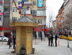 Polatlı Cumhuriyet Meydanı’ndaki çeşmenin üzerine çıkan kick boksçu Ahmet Aksu, çevredekilerin şaşkın başıkları arasında tehlikeli bir atlayış yaptı.